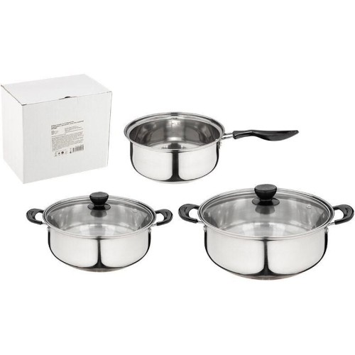 Набор посуды из 5 предметов PROMO: 2 кастрюли 1,25 л+2,2 л (с крышками)+ ковш 1,25 л (без крышки) Материал: нерж сталь, жаропрочное стекло, нейлон. Толщина стенок 0,3 мм, объемы: 1,25 л кастрюля, 2,2 л кастрюля, 1,25 л ковш. Размеры: 17,5*7,5 см/21,5*8,5см/17,5*7,5 см. (Диаметр*высота без крышки). Размеры с ручками: 30,7/24,3/28,4 см. Высоты крышек с ручками: 7,8/12,0/12,6 см. Дно однослойное. Подходит для всех типов плит. Не рекомендуется мыть в посудомоечной машине. Зеркальная полировка корпуса внутри и снаружи. Отметки литража. Ручки: нерж сталь+ нейлон. Крышка из жаропрочного стекла с отверстием для выпуска пара. Упаковка: стикер+белая коробка.