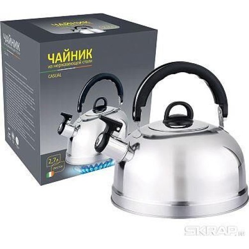 Чайник из нерж стали со свистком Casual, зеркальная полировка, литраж - 2,7 л, без тм Толщина стали - 0,25 мм Материалы - нерж сталь, пластик. Дно - однослойное. Подходит для всех типов плит. Упаковка - цветная коробка.