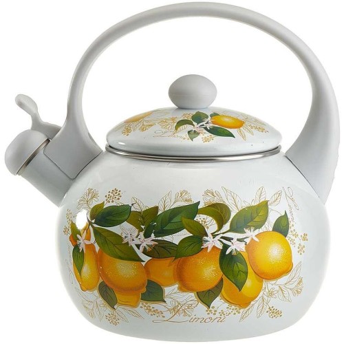 Параметры Объем 2,5 л Описание Чайник эмалированный со свистком Материалы: эмалированная сталь, нержавеющая сталь, пластик Серия: Лимоны Трехслойное внутреннее и внешнее эмалевое покрытие, устойчивое к воздействию пищевых кислот Эргономичная пластиковая ручка Зачерненное дно с повышенной термоотдачей Носик со свистком Классический дизайн Экологически чистые материалы Может быть использован на всех типах кухонных плит: электрических, газовых, керамических, индукционных Подходит для мытья в посудомоечной машине Упаковка: цветная коробка