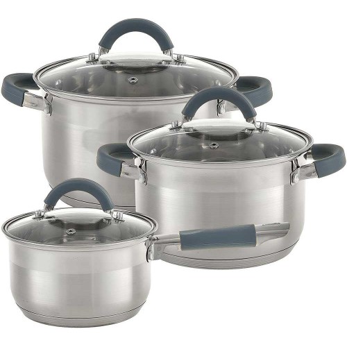 Параметры В наборе 6 предметов: ковш с крышкой 16×9,5 см; 2,1 л кастрюля с крышкой 18×11,5 см; 3 л кастрюля с крышкой 20×12,5 см; 4 л Толщина стали 0,5 мм Описание Набор 2 кастрюли и ковш из высококачественной нержавеющей стали со стеклянными крышками Серия: Profi Grey Термосберегающее дно: пятислойное дно с повышенной термоотдачей Термостойкое силиконовое покрытие ручек Специальная форма, исключающая скопление остатков пищи и жира Обод, препятствующий переливанию жидкостей через край Быстрый нагрев пищи, длительное удержание тепла Минимальные потери минеральных веществ, витаминов и вкусовых качеств Пригодны для использования на всех типах кухонных плит, включая индукционные Подходят для мытья в посудомоечной машине Упаковка: цветная коробка