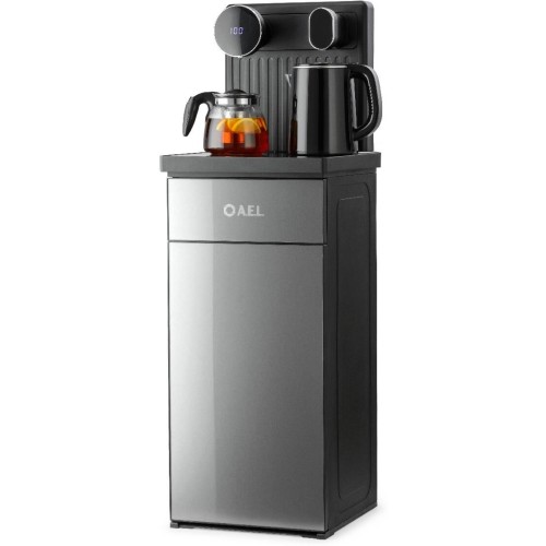 Оригинальное исполнение кулера с нижней загрузкой бутыли и без охлаждения, состоит из заварочного и электрического чайников, сенсорной панели управления и шкафчика для хранения. Яркая световая индикация и информативный дисплей на сенсорной панели сообщат о текущем режиме и подключении к сети. Цвет серый. Боковые стенки пластиковые. Объем чайников 1 литр. Размер в собранном виде 330x325x 995мм. Высота от пола до столешницы с чайниками 700мм.Скорости подачи воды комнатной температуры 1 л/мин. Сенсорная панель в зоне подогрева может нагреваться до температуры 60-70°C, поддерживая температуру воды примерно на уровне 30-40°C в заварном чайнике.