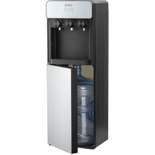 Кулер для воды LD-AEL-825a black/silver - напольный кулер с нижней загрузкой бутыли, с электронным охлаждением и поворотными кранами подачи воды. Корпус черного цвета с серебристыми вставками. Три крана подачи воды: горячей, холодной и комнатной температуры. На кране горячей воды располагается кнопка от случайного нажатия. В процессе эксплуатации аппарата в тот момент, когда вода в бутыли закончилась, на панели индикации загорится индикатор наличия воды в бутыли. Это символизирует о том, что необходимо заменить пустую бутыль. Рекомендованы следующие параметры бутыли 19л для данной модели - 270*270*500мм