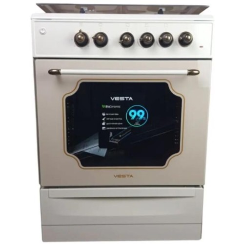Горелки стола: Газовые – 4 шт. Выдвижной ящик для посуды. Мощность горелок рабочего стола: Горелка передняя левая/правая – 2,0/2,4 кВт. Горелка задняя левая/правая – 2,0/1,0 кВт. Электрический духовой шкаф. Объем духовки в литрах: 65 л. Верхний/нижний нагреватель духовки – тен.Решетка рабочего стола – сталь. Крышка рабочего стола – стекло. Термометр духовки. Кнопка электророзжига горелок стола. Электрическая подсветка духовки. Противень – 2 шт.Чугунные решётки. В/Ш/Г 850/600/600