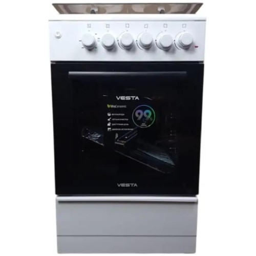Габариты ШхВхГ, см: 50х85х57; Горелки стола: Газовые – 4 шт. Мощность горелок рабочего стола: Горелка передняя левая/правая – 2,0/2,4 кВт. Горелка задняя левая/правая – 2,0/1,0 кВт. Электрический духовой шкаф. Объем духовки в литрах: 52.8 л. Верхний/нижний нагреватель духовки – тен. Решетка рабочего стола – сталь. Крышка рабочего стола – стекло. Термометр духовки. Кнопка электророзжига горелок стола. Электрическая подсветка духовки. Противень – 2 шт. Чугунные решетки. Выдвижной ящик.