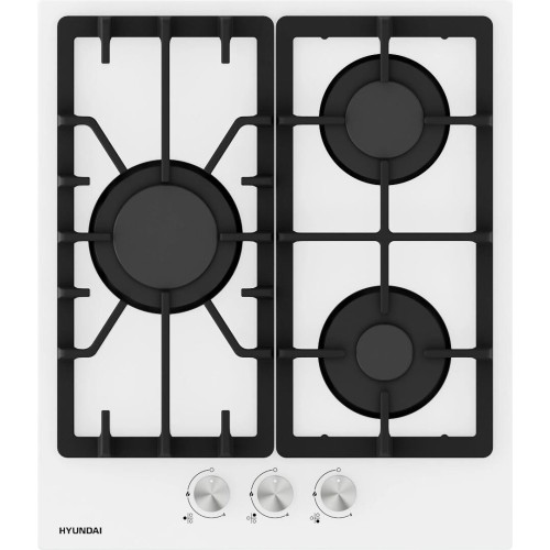 Газовая варочная поверхность, ширина 45 см, 3 газовые конфорки, электроподжиг, фронтальные чугунные решетки, материал поверхности - закаленное стекло, цвет - белый.