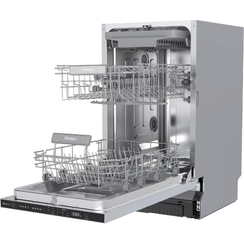 Встраиваемая посудомоечная машина 45 см; Класс энергоэффективности А+++; 10 комплектов; 8 программ: ЭКО, Авто, Гигиеническая мойка, Шепот, 90 мин, Быстрая мойка 35 мин, Предварительная мойка 14 мин, Самоочистка; 3 корзины; Сенсорное управление; LED индикатор (цвет белый); Таймер отсрочки 1-24 ч; Аквастоп; Луч на полу (точка), цвет синий; Автооткрытие дверцы; Двухзонная мойка; Дополнительная сушка\Сушка с подогревом; Напряжение 220-240 В; Частота 50 Гц; Номинальная мощность 1760~2100 Вт; Давление воды на входе 0,04~1,0 МПа; Мощность нагревательного элемента 1800 Вт; Шум 47 дБ(А); Самоочищающаяся система фильтров; Длина шнура питания 1500 мм; Длина впускного шланга 1500 мм; Длина выпускного шланга 1614 мм; Размер 448*550*815 мм; Вес нетто 37,0 кг