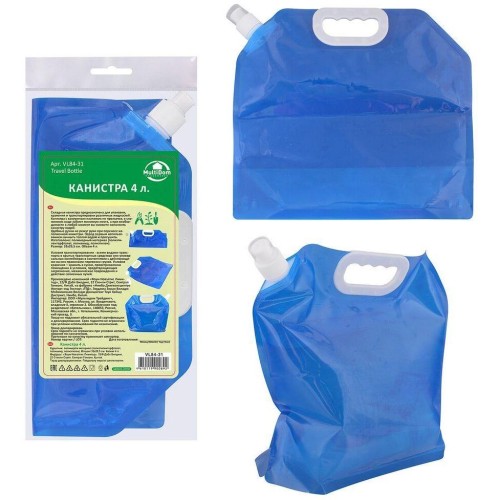 Складная канистра предназначена для упаковки, хранения и транспортировки питьевых и любых других жидкостей. Канистра с вакуумным клапаном не прольется, в сложенном виде займет минимум места, а при необходимости в любой момент вы сможете наполнить канистру водой. Удобные ручки не режут руки при переносе наполненной канистры. Изготовлено: полимерный материал (полиэтилентерфталат, полиамид, полиэтилен). Размер: 32х29,5 см. Объем 4 л. Условия транспортирования - всеми видами транспорта в крытых транспортных средствах или универсальных контейнерах в соответствии с действующими на них правилами перевозки грузов. Условия хранения – хранить в сухом, проветриваемом помещении в условиях, предотвращающих загрязнение, механические повреждения и действие солнечных лучей.