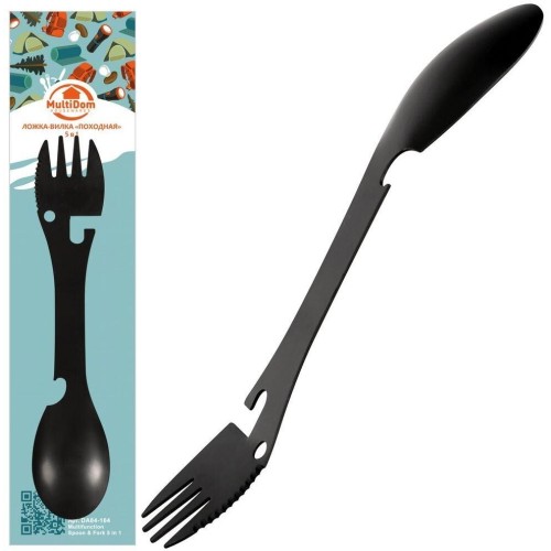 Ложка-вилка – это универсальный прибор, который обязательно пригодится на пикнике, в путешествии, походе, кемпинге, на рыбалке или охоте. Он избавит вас от необходимости возить с собой разные столовые приборы и тем самым минимизирует объём багажа. Прибор включает в себя: ложку, вилку, один край которой используется в качестве ребристого ножа, открывалку для бутылок, открывалку для консервов. Вы получите всё необходимое в одном приборе - мультитул. Благодаря имеющемуся отверстию, вы сможете подвесить или закрепить прибор в палатке, на рюкзаке или другом удобном для вас месте. Перед первым применением и после каждого использования рекомендуется вымыть губкой или мягкой щёткой, можно с жидким моющим средством, сполоснуть и просушить. Изготовлено из коррозионностойкой (нержавеющей) стали с эмалевым покрытием. Размер 18х3,5 см.