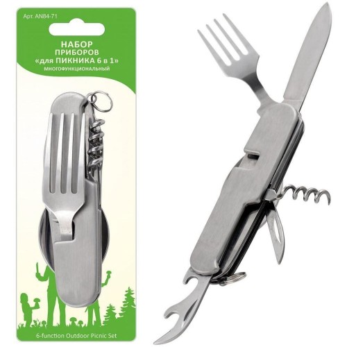 Незаменимый спутник в походе, на рыбалке и охоте. Компактность и многофункциональность оптимально совмещены в одном изделии. Помимо традиционных функций: нож, открывалка для бутылок и штопор - вам предлагаются такие предметы как шило, ложка и вилка. Изящество и небольшой размер являются отличительными особенностями этой модели, что выгодно отличает ее от аналогичных изделий. Изготовлен из коррозионностойкой (нержавеющей) стали.