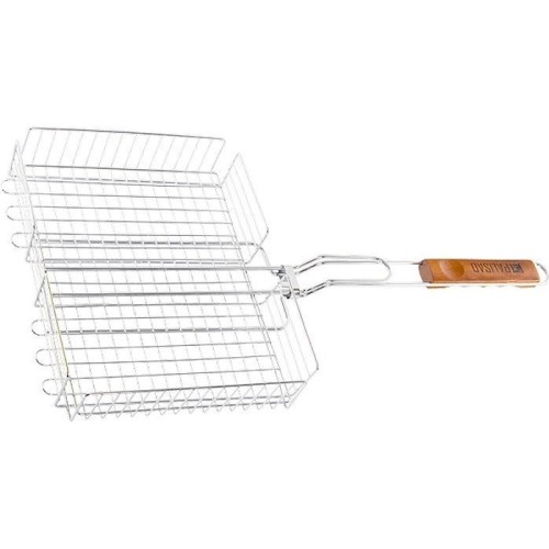 Решетка гриль 260х320х65мм объемная хромир. Конструкция объемной решетки гриль позволяет фиксировать верхнюю плоскость на разной высоте, поэтому на решетке можно запекать продукты различной толщины от стейков до куриных окорочков, не передавливая их и оставляя сочными. Высококачественная жаропрочная сталь. Эргономичная рукоятка. Широкое кольцо-фиксатор.
