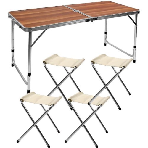 Набор мебели для кемпинга и пикника включает складную мебель - стол и 4 стула. Особенность стола туристического со стульями состоит в том, что она способна складываться, легко транспортироваться и храниться. Надежный комплект раскладывающейся мебели подойдет для сада, огорода, пикника или кемпинга. Прочный туристический столик и удобные тканевые стулья, готовые к транспортировке и перевозке, можно брать в поездки и путешествия. Цвет: дерево. Размер стола: 120x60x50/60/70 см. Размер стула: 35x31x27 см. Материал: МДФ, сталь, полиэстер. Упаковка: коробка.