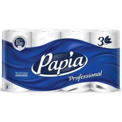 Туалетная бумага Papia белая с рисунком, тиснением, перфорацией. Роскошно мягкая, белая бумага, произведенная из чистой 100% целлюлозы, с уникальным двусторонним тиснением B-side. Состав: 100 % целлюлоза. Количество в упаковке: 8 рулонов. Количество слоев: 3. Длина рулона: 20 м.