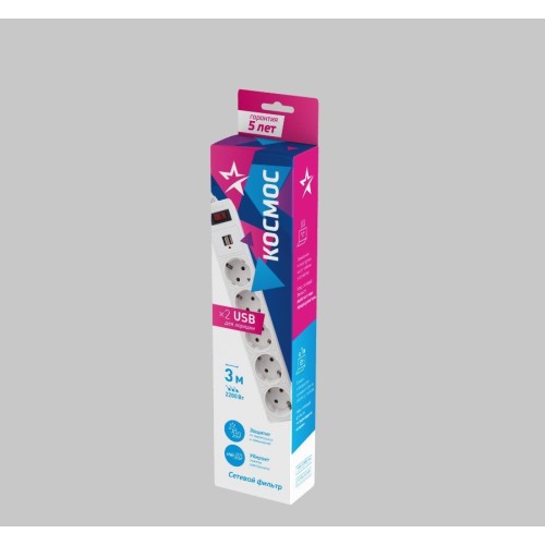 Сетевой фильтр Космос защищает Вашу технику от выхода из строя из-за "некачественного" тока: защита от многоразовых перегрузок и замыканий. Лучше всего подходит для подключения чувствительной электроники: компьютеров, телевизоров, стериосистем и т.д. Максимальная мощность 2200 Вт, что достаточно для одновременного подключения двух ноутбуков, телевизора, игровой приставки и любого другого мощного устройства. 100% медный трехжильный кабель с сечением 0,75мм, пожаробезопасный корпус. индикатор сети. Номинальный ток 10А. 220В. предохранитель - биометаллический размыкатель. Модель с USB - 2 дополнительных слота для зарядкт гаджетов 2.1A, 5V Цвет белый