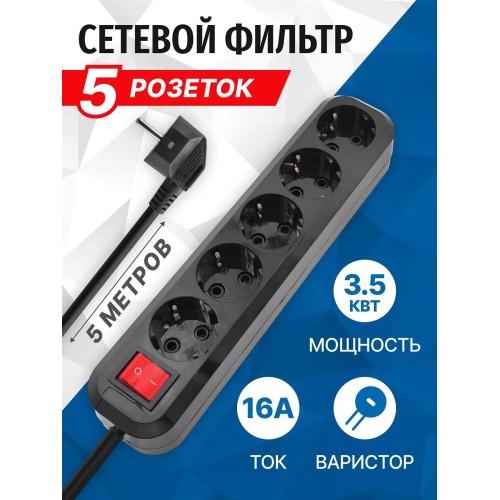 Производитель: 5BITES Количество выходных розеток: 5 Тип розеток: EURO / RUS Расположение розеток: диагональное Защитные шторки: — Ограничитель импульсных помех: варистор Суммарный ток нагрузки (А): 16 (возможно подключение крупной бытовой техники) Суммарная мощность нагрузки (кВт): 3.5 Рабочая частота (Гц): 50 Номинальное напряжение (В): 220-230 Выключатель: со световой индикацией Материал корпуса: ударопрочный ABS пластик, не поддерживающий горение Сечение кабеля (мм?): 1.5 Длина кабеля (м): 5 Защитные функции: ограничение импульсных помех Цвет: черный