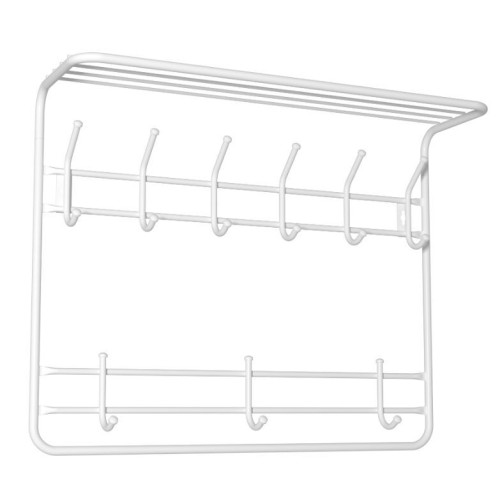 Надежная сборно-разборная конструкция. — компактная 2-х ярусная вешалка с 9-ю крючками. — удобная полка для хранения головных уборов. — допустимая нагрузка до 5 кг на крючок. — Удобный пластиковый крючок для мелочей. — Расстояние между крепёжными отверстиями 625 мм. Материал Сталь, полимерное покрытие. Габариты (Д*Ш*В) 73х58х22 см.