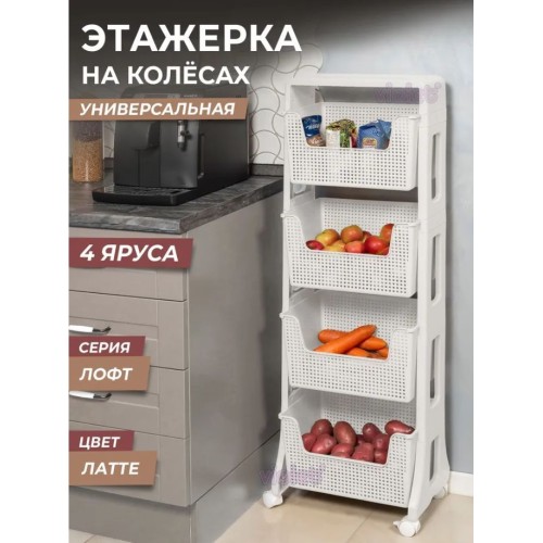Размер 4 ярусной этажерки в собранном виде – 395х260х1228мм. Вес товара, г 3400 Пластиковая этажерка в стиле Лофт на колесах - универсальное решение для компактного хранения в доме, офисе или на даче. Стильная этажерка на колесиках с ящиками - кармашками выполнена из пластика, не содержащего бисфенол А, она абсолютно безопасна для здоровья и может использоваться в любом уголке Вашего дома - в кухне, ванной, гостиной, детской комнате, на балконе, а также на даче. Кроме того, полки и стойка тележки выполнены в лаконичном дизайне и универсальных цветах - белый, серый, латте - органайзер для хранения подойдет для парикмахерской, салона красоты, массажного кабинета, медицинского центра. Преимущество этажерок пластиковых в их лёгкости, устойчивости к влаге и простоте в уходе. Поэтому пластмассовый органайзер на колесиках очень удобен как для хранения игрушек, книг и канцелярии в детской, так и для хранения кухонной утвари, овощей и фруктов на кухне.