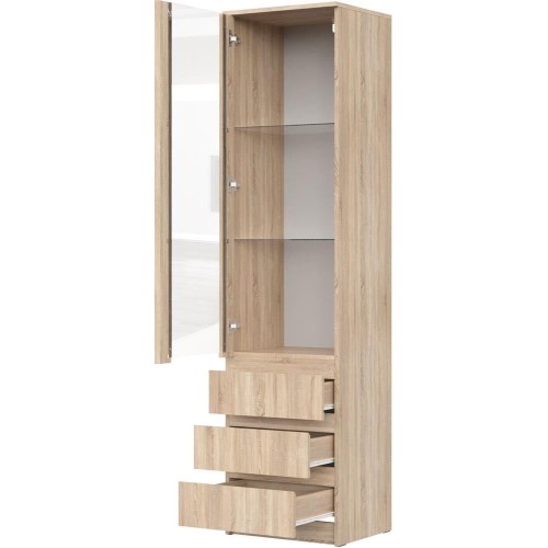 Шкаф-витрина с распашной дверцей со стеклом и тремя ящиками. Корпус и фасад изготовлены из ЛДСП 16 мм. Три цвета на выбор - Белый, Дуб Сонома, Дуб Вотан. Размер изделия (ШхВхГ) 50,1 х 200,3 х 43,3 см.
