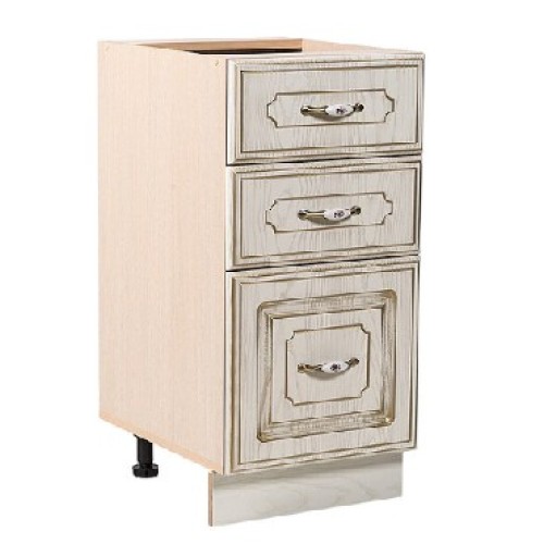 Кухонный модуль (стол рабочий) кухни АНЖЕЛИКА. Глубина рабочего стола со столешницей 600 мм. Высота рабочего стола со столешницей 860 мм. Комплектуется столешницей Королевский Опал Темный или Королевский Опал Светлый. Стол рабочий на 400 мм с тремя ящикам верхние два меньшей глубины, с неполным декором фасадов. Цоколь и столешница не входят в стоимость рабочих столов и навесных шкафов. Направляющие ящиков - шариковые, усиленные. Корпус изготавливается из ЛДСП. Фасады выполнены из МДФ, окрашены, патина нанесена вручную, сверху защищены матовым итальянским лаком. Ножки регулируемые по высоте 100 мм. Габариты: ВхГхШ (820х510х400)мм. Стиль: Классика. Геометрия: Прямой. Материал каркаса: ЛДСП. Материал фасада: МДФ. Цвет корпуса: ясень. Цвет фасада: ясень.