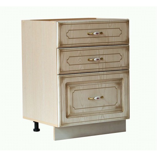 Модуль кухни "Анжелика"-Стол 3 ящика 600. Размер ШхГхВ (600х510х820)мм с ножками но без столешницы, высота со столешницей 860 мм. Кухня Анжелика в классическом стиле, сочетающая роскошь классики с современной практичностью - гарнитур из модульной системы фабрики Бител. Красивые патинированные фасады из МДФ с роскошной фрезеровкой, подчеркнутой золотом, имитируют натуральное дерево и способны создать поистине дворцовую обстановку на вашей кухне. Фрезеровку фасадов дополняют балюстрады с балясинами, рамочные фасады с рисунками на стекле, классические ручки под бронзу с керамической вставкой. Модульную систему характеризуют качественные материалы и фурнитура, большое число модулей различного назначения и размеров на выбор, модули с радиусными фасадами, фасады с фрезеровкой, резной декоративный багет.