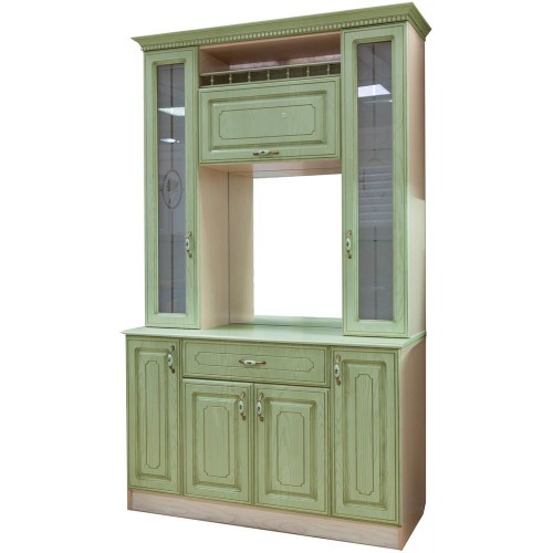 Классический буфет Анжелика с патиной.Классический дизайн и плавные линии буфета АНЖЕЛИКА создают атмосферу красоты и гармонии. Две витрины со стеклянными полками, 4 шкафчика хранения посуды и ящик для столового серебра. Направляющие ящика ПОЛНОГО выдвижения.Ручка БРОНЗОВАЯ с керамической отделкой. Стекло матированное с рисунком. Ширина: 464 мм Высота: 2250 мм Глубина: 1365 мм