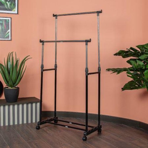Двойная стойка на колесиках для одежды, с дополнительными крючками для аксессуаров - прекрасное решение для организации пространства в вашем доме. Надёжная конструкция изготовлена из хромированной стали и пластика. Быстро и легко собирается. Имеется подставка для обуви, дополнительные крючки для различных аксессуаров, а с помощью колёсиков вешалку можно перемещать вместе с одеждой. Размеры в собранном виде: 68*40*135 см Материал: Металлическая труба 19-22*0,2 мм, полипропилен Цвет трубы: Черный/серебристый Максимальная нагрузка: 20 кг Вес нетто штуки: 1,2 кг Вес брутто штуки: 1,5 кг Размеры индивидуальной упаковки: 65.5*12*7 см Размеры транспортной коробки: 67*32*37 см Количество в транспортной коробке: 12
