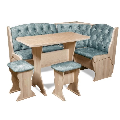 В комплект кухонного уголка Орхидея Люкс Лагуна входит: стол обеденный со столешницей в цвет корпуса с термостойким покрытием, два табурета Тюльпан, кухонная скамья с размером 1080 мм на 1480 мм, с внутренними ящиками для хранения под сидением, декор мягкой части-каретная стяжка. Габариты ВхГхШ (880х1080х1480)мм. Стиль: Классика. Материал каркаса: ЛДСП. Цвет корпуса: ясень. Обивка: велюр. Цвет обивки: Лагуна. Ящик для хранения: да. Суммарный объем упаковки: 0,256 куб.м.