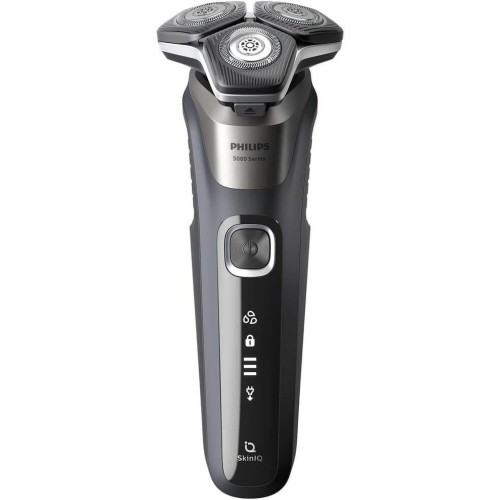 Электробритва для сухого и влажного бритья Series 5000, мощность 9Вт, роторная, Количество бритвенных секций -3, Плавающие головки, Подвижный бритвенный блок, индикатор блокировки, индикатор заряда батареи, индикатор очистки, Отсек для сбора волосков, Режимы и функции: технология SkinIQ, Возможность чистки под струей воды, Автоматическая очистка ,Дорожная блокировка, Источник питания от аккумулятора, Тип элементов питания Li-ion, Время автономной работы 60 мин, Быстрая зарядка, Подставка для зарядки, Щеточка для чистки ,Защитная крышка, Нескользящая вставка на рукоятке, Дорожный чехол , Насадки: триммер, дополнительно головки 5D Pivot & Flex. Цвет черный