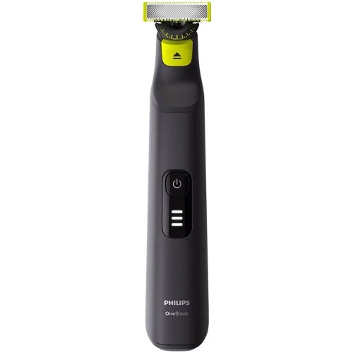 Триммер OneBlade Pro, Инновационное лезвие 360, Насадки (4): Насадка для защиты чувствительных участков кожи, насадка -гребень для тела (3 мм), дополнительное сменное лезвие, Гребень с 14 установками длины (стрижка от 0,5 мм до 10 мм). 90 мин работа, 1 ч зарядка. Дисплей: 3 LED-индикатора состояния батареи. Сухое и влажное бритье. Цвет Черный