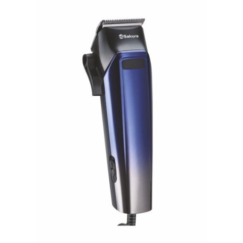 Стальные лезвия, работа от сети 220-240 В, мощный мотор (7 Вт), 3-ступенчатая регулировка лезвия с помощью рычажка, кабель питания 1,8 м, в комплекте: 4 насадки (3, 6, 9 и 12 мм), расческа, ножницы, масло, кисточка для очистки. Цвет: синий/ черный
