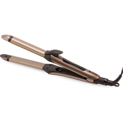Мультистайлер. Максимальная температура нагрева 200 °C, Мощность 50 Вт, Количество режимов нагрева -5, Керамическое покрытие, Регулировка температуры, Вращение шнура, Длина сетевого шнура - 1,8 метра, Возможность выпрямления волос, Защита от перегрева, Насадка-щипцы для завивки, Ненагреваемый наконечник. Цвет: Золото