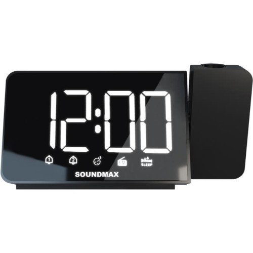 Светодиодный дисплей с высотой символов 1,6” (4.06 см) Регулируемая яркость дисплея (3 уровня) Кварцевый стабилизатор Два будильника Два режима работы будильника (сигнал/радио) Отложенный сигнал будильника Отключение радио по таймеру Настраиваемый проектор Регулируемая яркость проектора (2 уровня) FM-тюнер (87.5 – 108 МГц) Выходная мощность: 1 Вт Питание от адаптера (в комплекте) Индикация: белая Цвет: чёрный