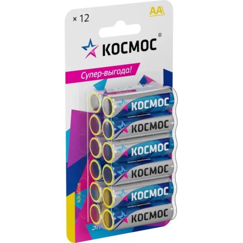 Щелочные (алкалиновые) батарейки Космос – в упаковке 12 шт - выгодная большая упаковка для розницы. Типоразмер батареек АА также называют «пальчиковые» (на приборах-потребителях может обозначаться как LR6, R6, UM3). Работают как дорогие батарейки – по рез