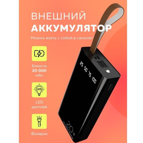 Повербанк на основе литий-полимерного источника с энергоемкостью 20000 мА*ч обеспечивает выполнение нескольких полных зарядок смартфона, планшета, МР3-плеера, смартфона или другого портативного устройства.