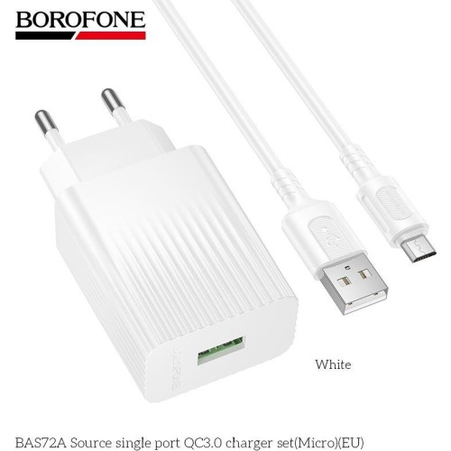 Сетевое зарядное устройство Borofone BAS72A – надежный адаптер с функцией быстрой зарядки, который поможет вам всегда оставаться на связи. Оснащен стандартной сетевой вилкой и USB портом для подсоединения кабеля, что делает его универсальным решением для зарядки смартфонов, планшетов и другой цифровой техники. Блок питания Borofone BAS72A поддерживает функцию быстрой зарядки QC 3.0 и выдает максимальную мощность в 18W. Изготовлен из качественных материалов: огнезащитного PC и ABS-пластика, что обеспечивает безопасность и долговечность использования аксессуара. Поставляется в комплекте с кабелем USB - micro USB длиной 1 м.