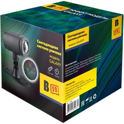 Светодиодная система B52 "GALAXY"- уличная светодиодная система с абстрактной проекцией, создающей эффект "космос". Цвет свечения - RGB. Управляется пультом ДУ. Работает при температуре воздуха до -30°С. Рекомндуемое расстояние проекции - до 15м.