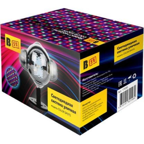 В52 "COLOR SPOTS" - уличная светодиодная система с проекцией разноцветных точек. 4 цвета свечения: красный/синий/зеленый/белый. Работает в автоматическом режиме. Разрешено эксплуатировать при температуре воздуха до -30°С.