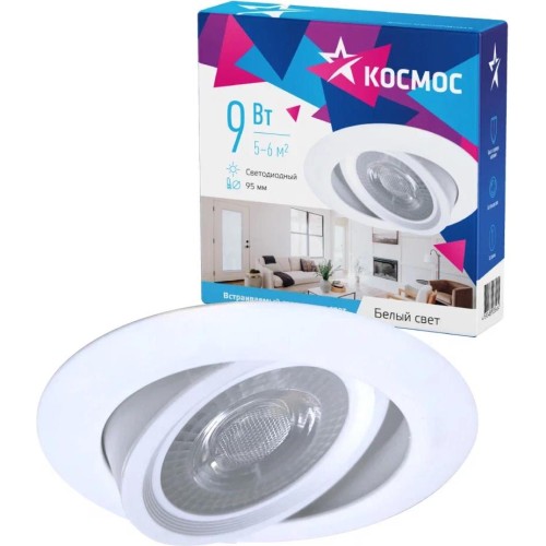 Поворотный светодиодный спот 9 Вт под стандартное посадочное место 95мм. Осветит пространство площадью 5-6 м?. Споты светят пучком в 45°, что создаёт нужные световые акценты в современном освещении. Для этого их можно повернуть в нужную сторону. Совместим