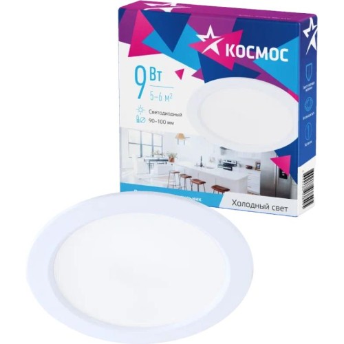 Тонкая светодиодная панель 9 Вт под стандартное посадочное место 90-100мм. Осветит пространство площадью 5-6 м?. Совместима с любыми типами подвесных потолков: натяжных, реечных, из ГКЛ и др. Толщина панели 23мм, диаметр 114мм. Стабильный свет без падения