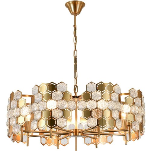 Мед вызывает приятные ощущения и даже счастье у некоторых людей. Сладость стимулирует выработку дофамина - гормона, который отвечает за чувство удовлетворения и радости. Светильник серии DELIZIA словно услада для вашего дома. Сочетание текстурного стекла и металлической арматуры в форме сот собирают светильник в единый образ домашнего уюта и тепла. Размер 700*700*450/750 Мощность E14 6?40W Цвет ЛАТУНЬ/ПРОЗРАЧНЫЙ С ЭФФЕКТОМ КАПЕЛЬ Материал МЕТАЛЛ/ХРУСТАЛЬ