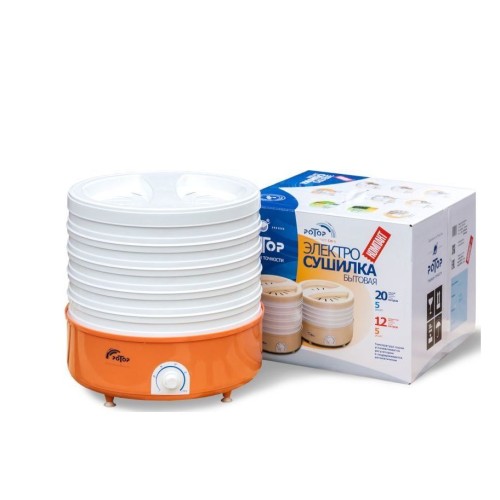 Сушилка для овощей и фруктов. 5реш складывающиеся (цветная упаковка). Мощность 520 Вт. Регулировка температуры от 20 до 70 °С. Особенность данной модели – складывающиеся решета. В зависимости от цели использования, при регулировании положений боковых рёбер, объём сушильной камеры может увеличиваться или уменьшаться. Рабочий объём сушильной камеры – 20 л., компактный объём – 12 л.