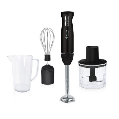 Блендер погружной. Мощность: 1000 вт, Количество скоростей: 2, Управление: механическое, Материал корпуса: пластик, Материал погружной части: нержавеющая сталь, Емкость измельчителя: 500 мл, Емкость мерного стакана: 800 мл, Венчик для взбивания, Длина сетевого шнура: 110см, Цвет: Черный