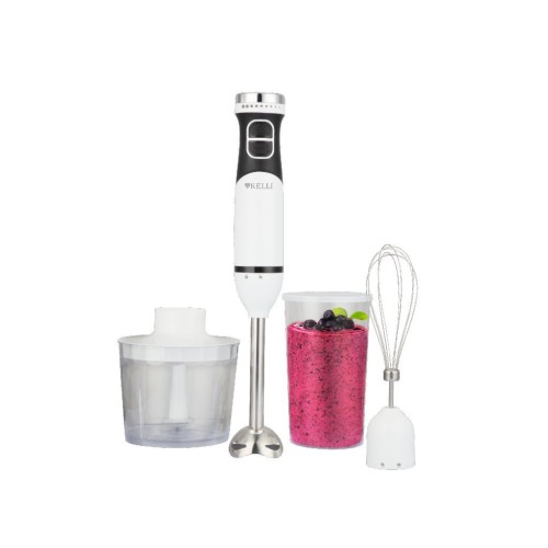 Блендер * Мощность: 1500 Вт * Мерный стакан: 700 мл * Чаша измельчителя: 500 мл * Венчик для взбивания * Ножи из нержавеющей стали * Число скоростей: 2 * Удобная эргономичная прорезиненная ручка * Плавный регулятор мощности * Металлическая погружная часть * 220-240 В, 50\ Гц * Мощный мотор *