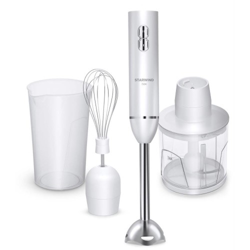 Блендер погружной. Мощность 750 Вт, Регулировка скорости вращения, Количество скоростей / режимов 2, Режим измельчения, Электропитание от сети, Цвет белый, Материал корпуса пластик, Материал ножей нержавеющая сталь, Материал погружной части нержавеющая сталь, Венчик для взбивания, Измельчитель в комплекте, Нескользящая основа, Срок гарантии 12 мес.