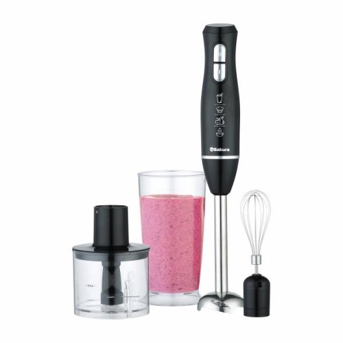 600 Вт, мощный и тихий DC мотор, 2 скорости работы, лезвия из нерж.стали, погруж.часть блендера из нерж.стали, насадка-венчик из стали, градуированный стакан (0,7 л), чоппер (0,5 л) с острыми ножами из нерж.стали