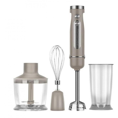 Блендер погружной ( набор). Мощность: 1200 Вт, Материал чаши: пластик, материал корпуса: металл/пластик, Количество скоростей: 5, Насадки: венчик для взбивания, измельчитель, Мерный стакан в комплекте, Защита от перегрева/перегрузки, плавная регулировка скорости, Нескользящие ножки, Турборежим, Цвет: бежевый