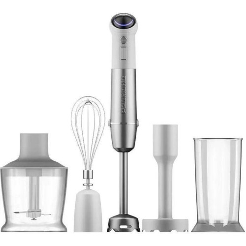 Блендер погружной Тип управления электромеханический Номинальная мощность 1600 Вт Максимальная мощность 1800 Вт Материал корпуса металл пластик Скорость работы в основном режиме 10000 - 15000 об/мин Режим турбо Скорость работы в турборежиме 15000 об/мин Плавная регулировка скорости Скорости работы плавная регулировка скорости Чаша измельчителя Мерный стакан Материал погружной части металл Объем чаши измельчителя 500 мл Объем мерного стакана 600 мл Объем стакана для смешивания 600 мл Цвет корпуса серый Насадка-блендер Насадка-венчик Насадка-пюре Форма ножа 4-лепестковый с титановым покрытием Защита от поражения электрическим током класс II Защита от перегрева Защита от перегрузки Индикация светодиодная Длина шнура электропитания 1,1 м Габаритные размеры 60 ? 430 ? 67 мм Вес нетто 1,6 кг ± 3% Комплектация блок электродвигателя насадка-блендер насадка-венчик переходник для насадки-венчика стакан для смешивания насадка для приготовления пюре чаша измельчителя с крышкой S-образный нож