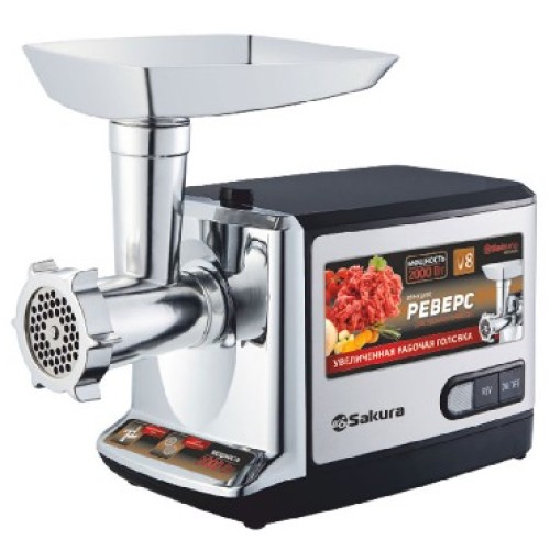 Мощность: 2000 Вт Функция реверс Материал корпуса: нержавеющая сталь с хромированной вставкой Прорезиненные ножки Материал лотка: металл Толкатель Материал шнека: металл Материал ножа: нержавеющая сталь Диски для измельчения: 5 мм и 8 мм, материал: металл Длина сетевого кабеля: 1,2 м Отключение при перегреве
