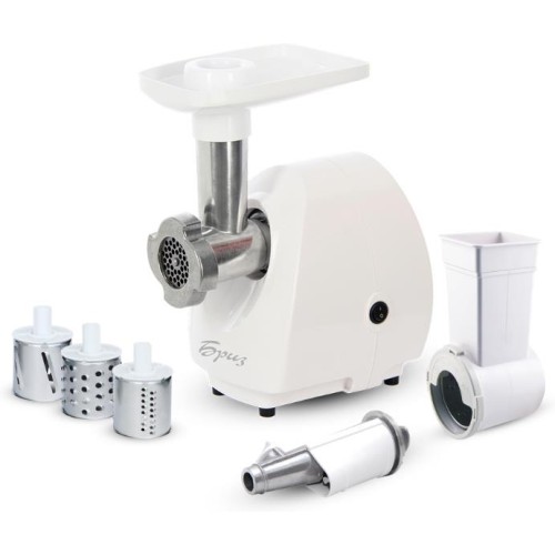 Максимальная мощность — 1000 Вт. Максимальная производительность — 1,3 кг/мин. В комплекте: решётка 5 мм - 1 шт - пластиковый колпачок 1 шт - приставка овощерезка с 3 барабанами (крупная, мелкая терка и шинковка) - приставка соковыжималка Преимущества: двойная защита двигателя от перегрузки, высокое размещение шнековой камеры, отсек для хранения шнура питания. экономичное энергопотребление
