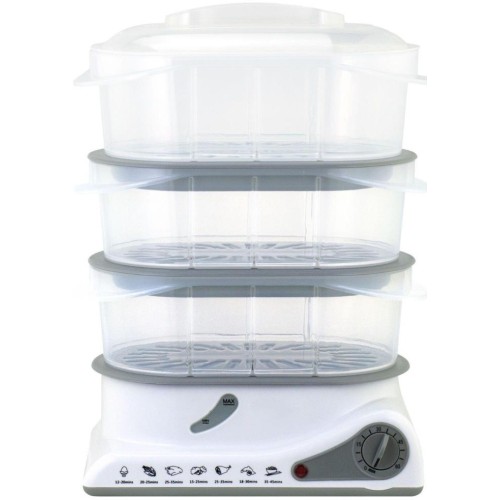 Электрическая пароварка; Мощность: 1100 Вт; Объём всех ёмкостей: 11 л; Таймер на 60 минут; Защита от нехватки воды; Управление: механическое; Материал корпуса: пластик, нержавеющая сталь; Нагревательный элемент из нержавеющей стали; Сеть: 220-240В, 50/60Гц,