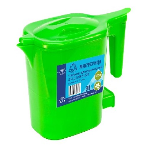 Мощность 500Вт. Объем 0,5л. Корпус пластик. Шкала уровня воды, нагревательный элемент - ТЭН спираль из нержавеющей стали, съемный шнур. Время закипания 3 мин. Цвет зеленый.